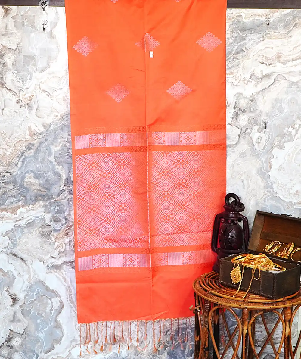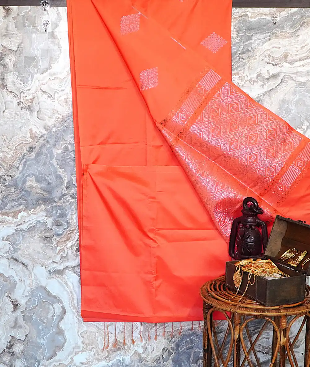 Add a radiant touch to your ethnic wardrobe with this beautiful semi-soft silk saree, featuring a vibrant coral orange body that exudes brightness and charm. The saree is adorned with large diamond-shaped patterns woven in pale silver zari, creating a refined and elegant appeal.
