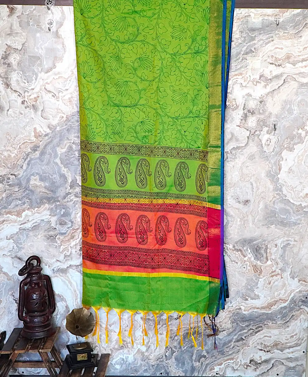 Fresh lime green semi-soft silk saree with floral vine patterns, complemented by a vibrant magenta border and paisley motif pallu for a lively festive look.