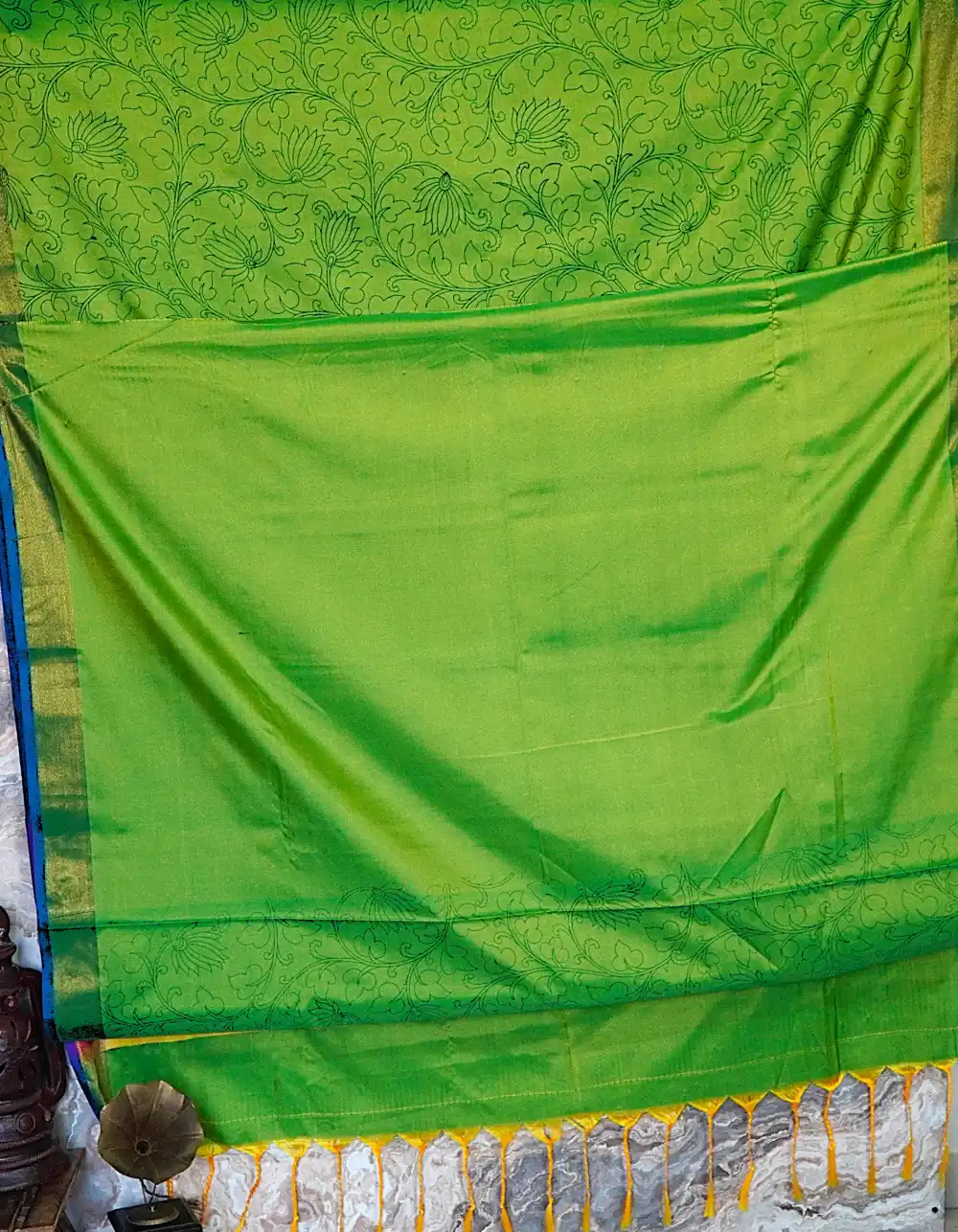 Bring a refreshing charm to your ethnic collection with this beautiful semi-soft silk saree, featuring a vibrant lime green body adorned with large dark green floral vine outlines. The design creates a graceful yet eye-catching appeal, perfect for festive occasions.