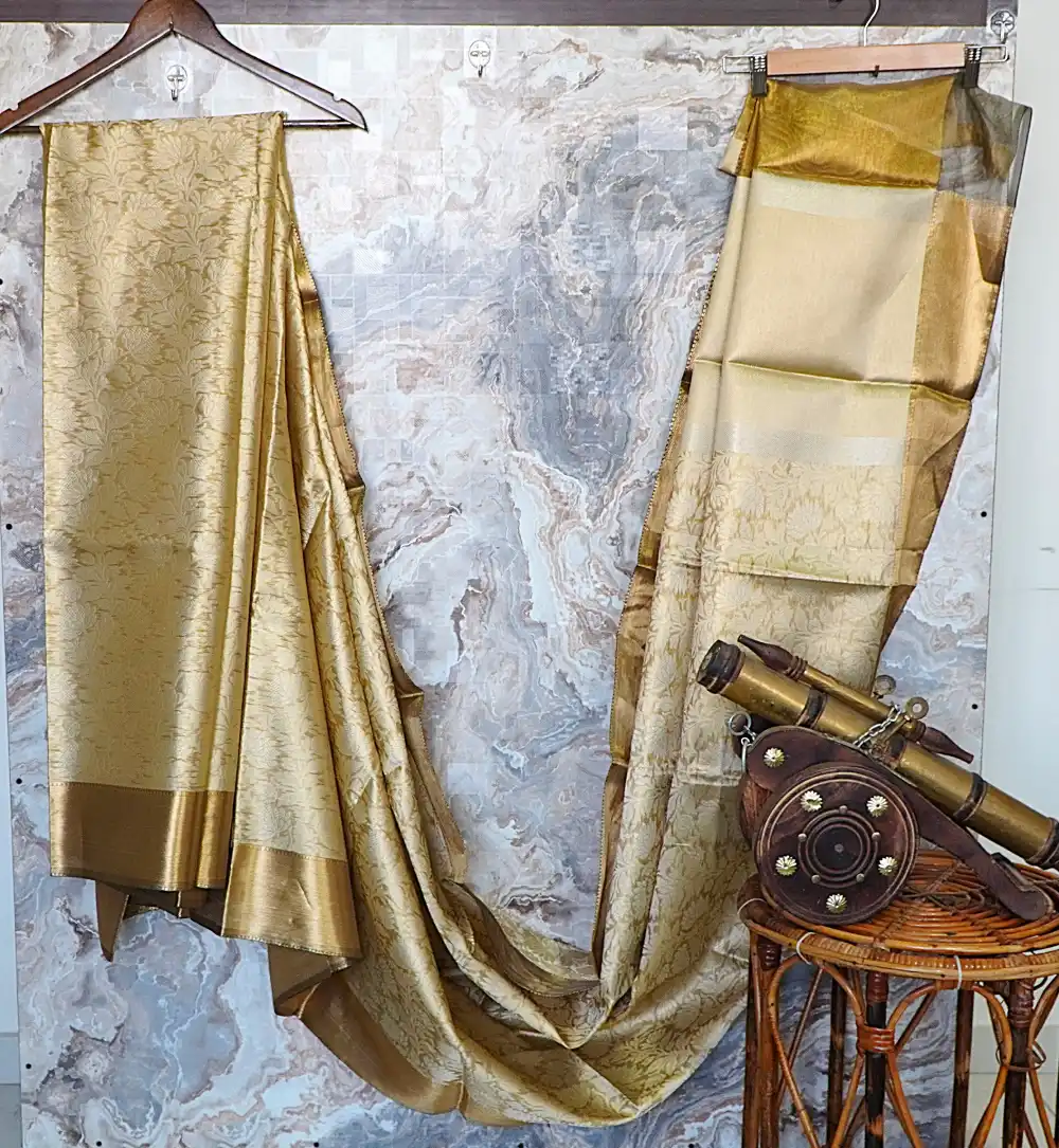 Exude timeless elegance with this regal champagne gold soft tissue saree, designed in a rich monochromatic tone that reflects sophistication and grace. The saree features an intricate floral jacquard weave across the body, adding depth and texture to its luxurious appearance.