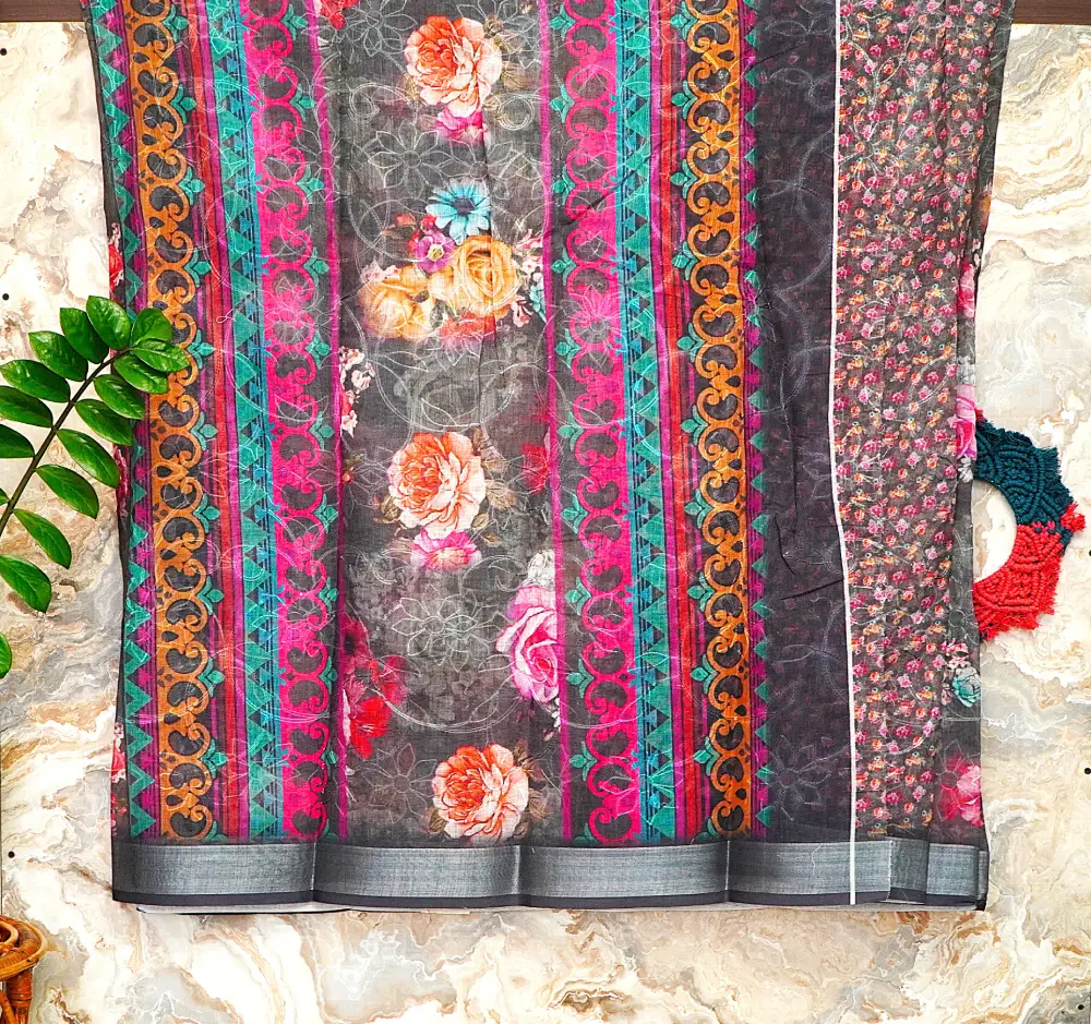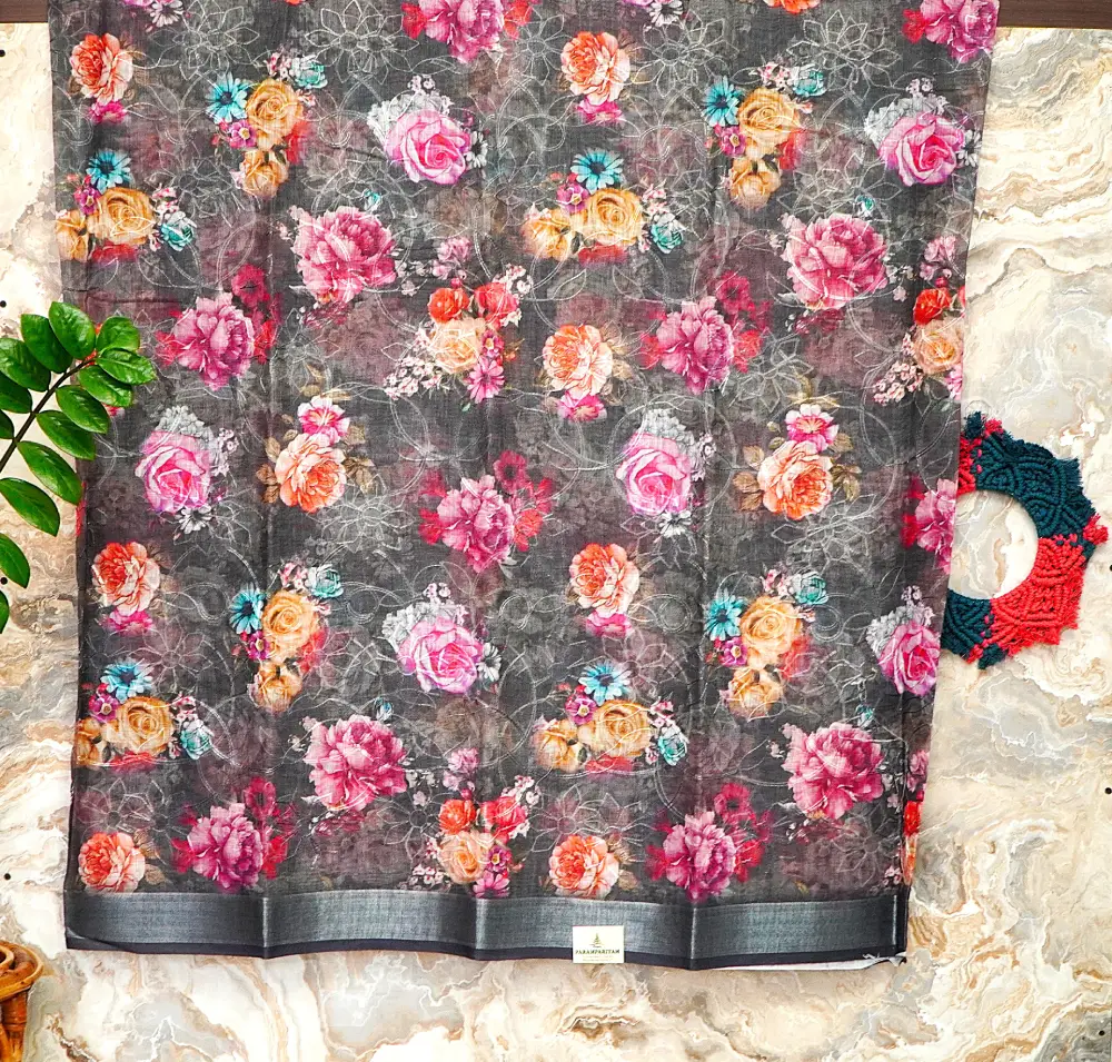 Make a bold and sophisticated statement with this stunning charcoal-grey linen saree, featuring a dramatic all-over floral print of magenta and coral roses that adds depth and vibrancy.
