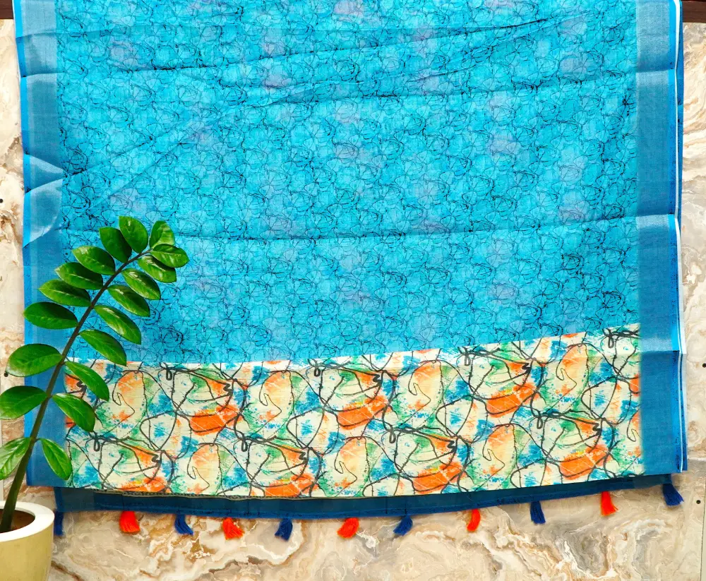 - Fabric: Lightweight printed saree