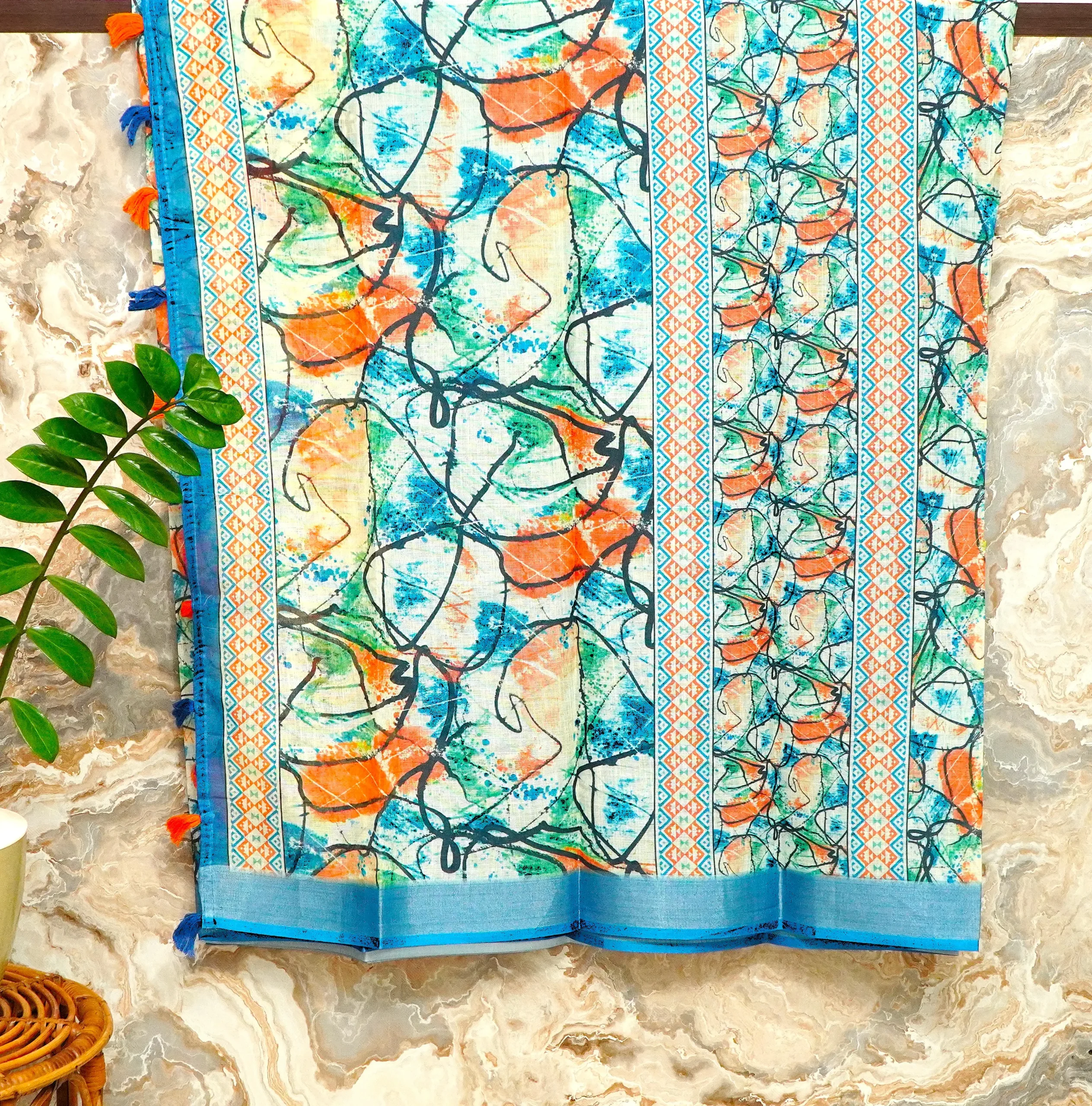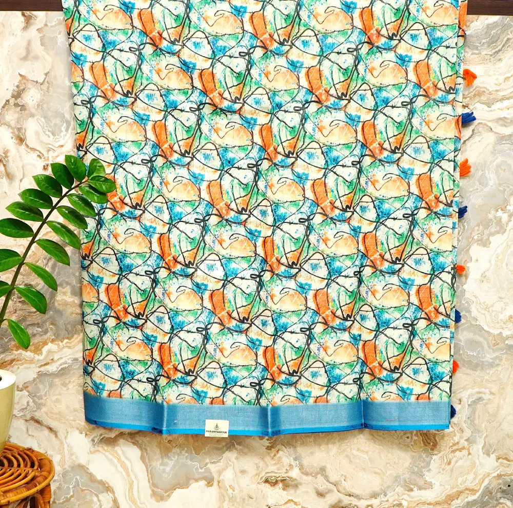 Make a bold contemporary statement with this unique saree, featuring a vibrant cream base inspired by modern abstract art. The design showcases striking cerulean blue, orange, and green paint-splatter motifs, layered with fluid black linework that adds artistic depth and character.