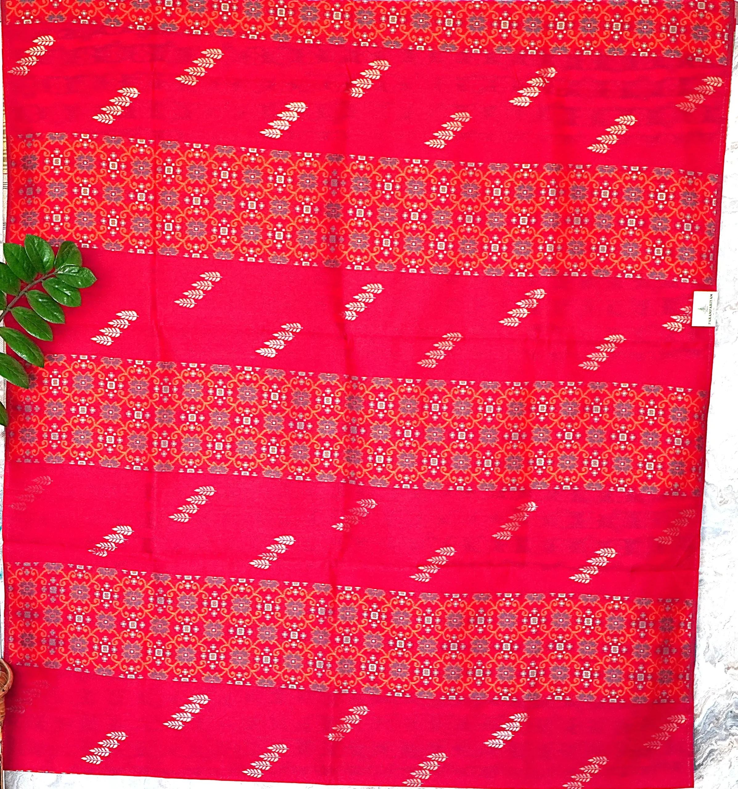 Make a bold and elegant statement with this striking crimson red saree, beautifully adorned with delicate gold leaf motifs that add richness and traditional charm.