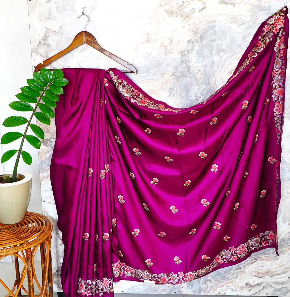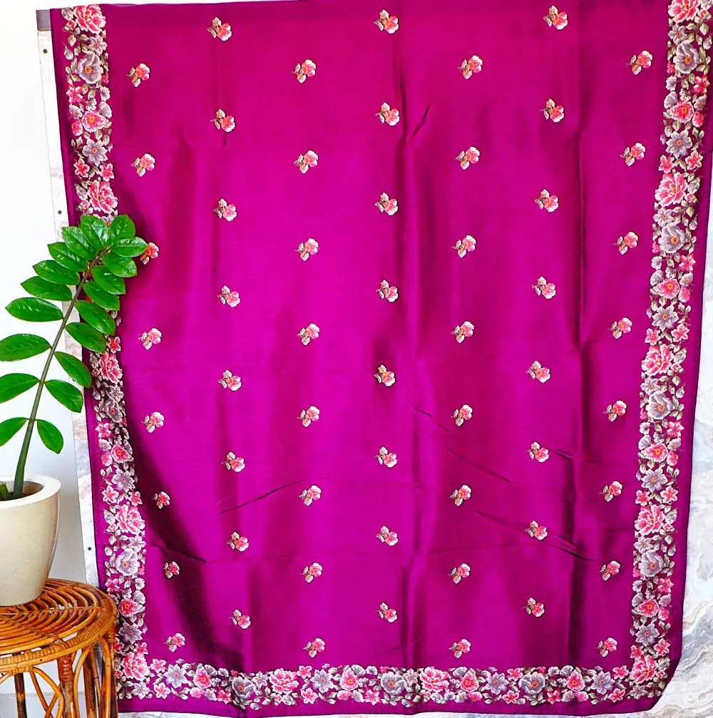 This regal deep magenta silk saree is designed to make a statement with its rich tone and vibrant detailing. It features a beautifully crafted multi-coloured floral border, complemented by delicate butis in soft peach and lavender hues that add a touch of subtle charm.