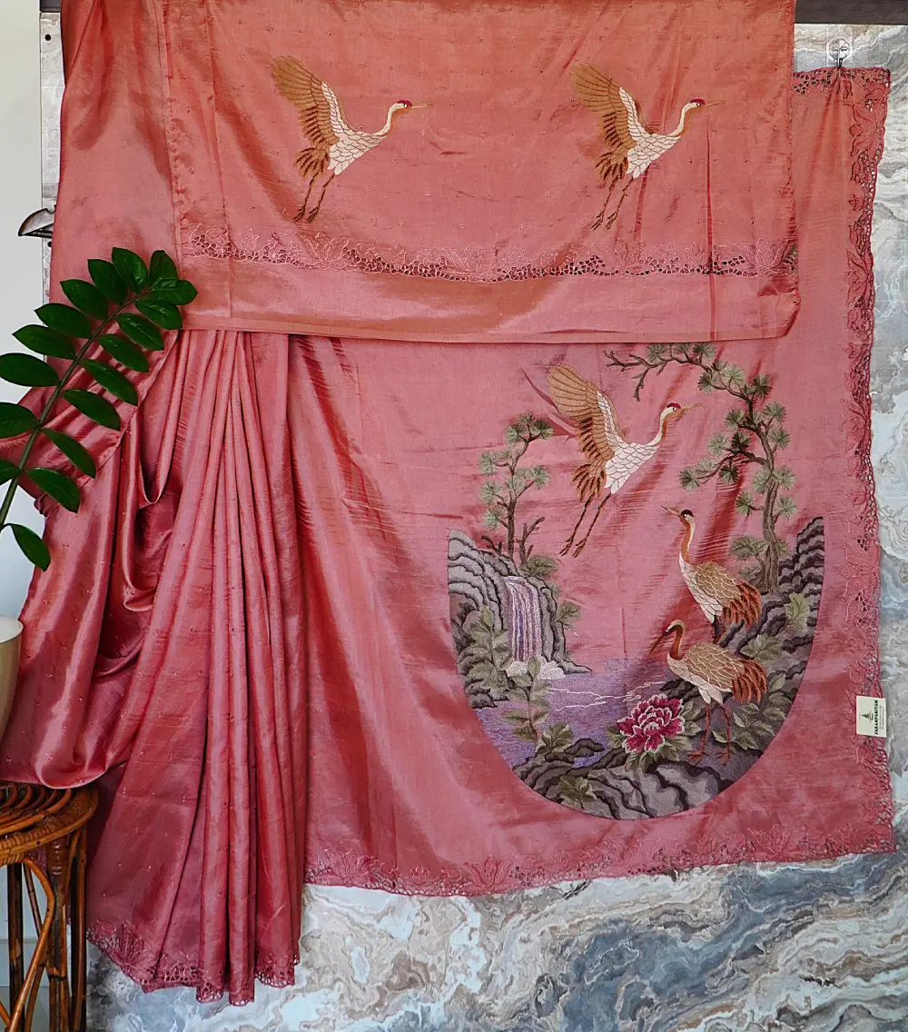 This elegant dusty rose silk saree is designed with a refined nature-inspired theme, beautifully showcasing intricately embroidered cranes, a tranquil waterfall landscape, and delicate floral cutwork lace.