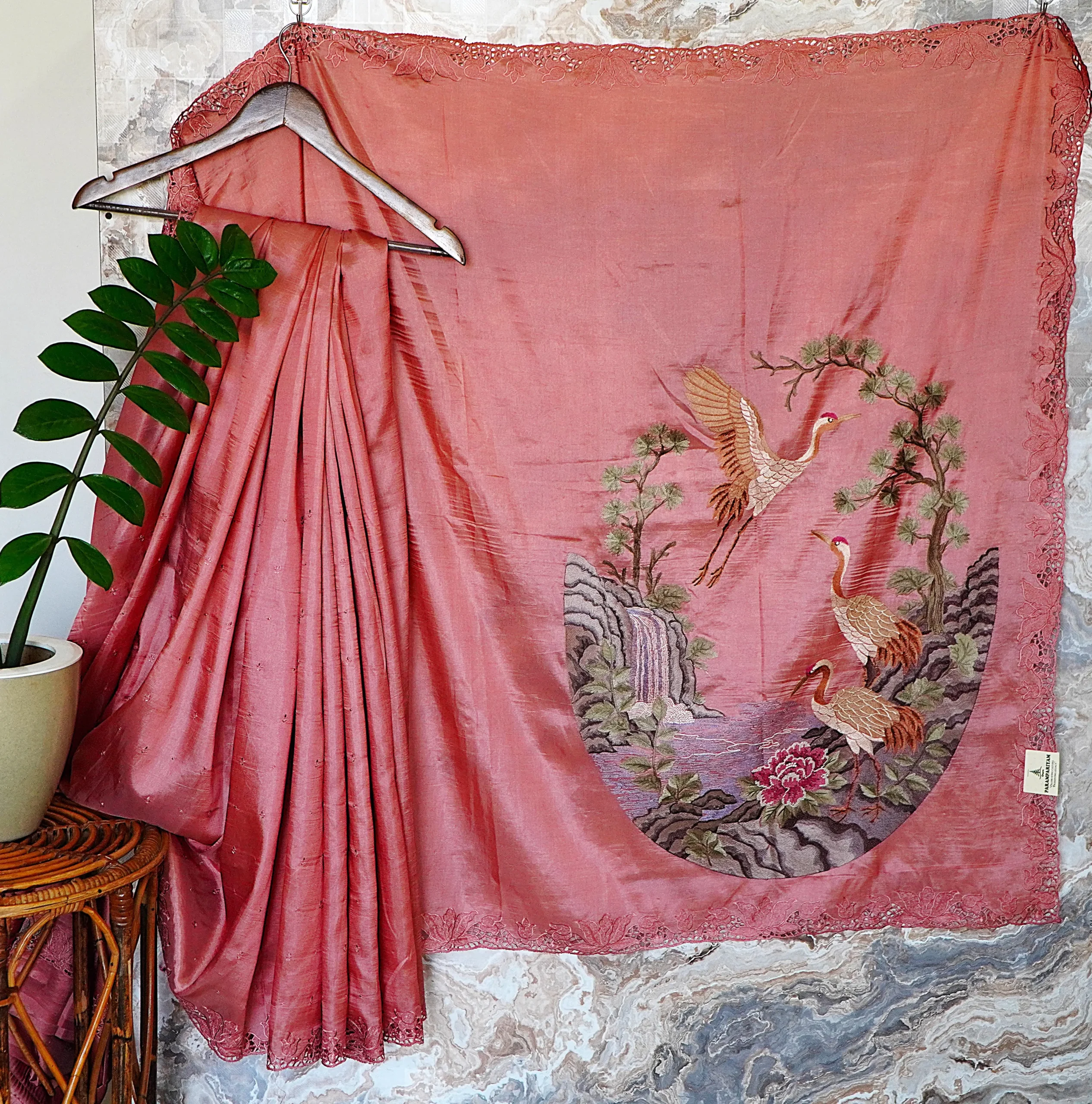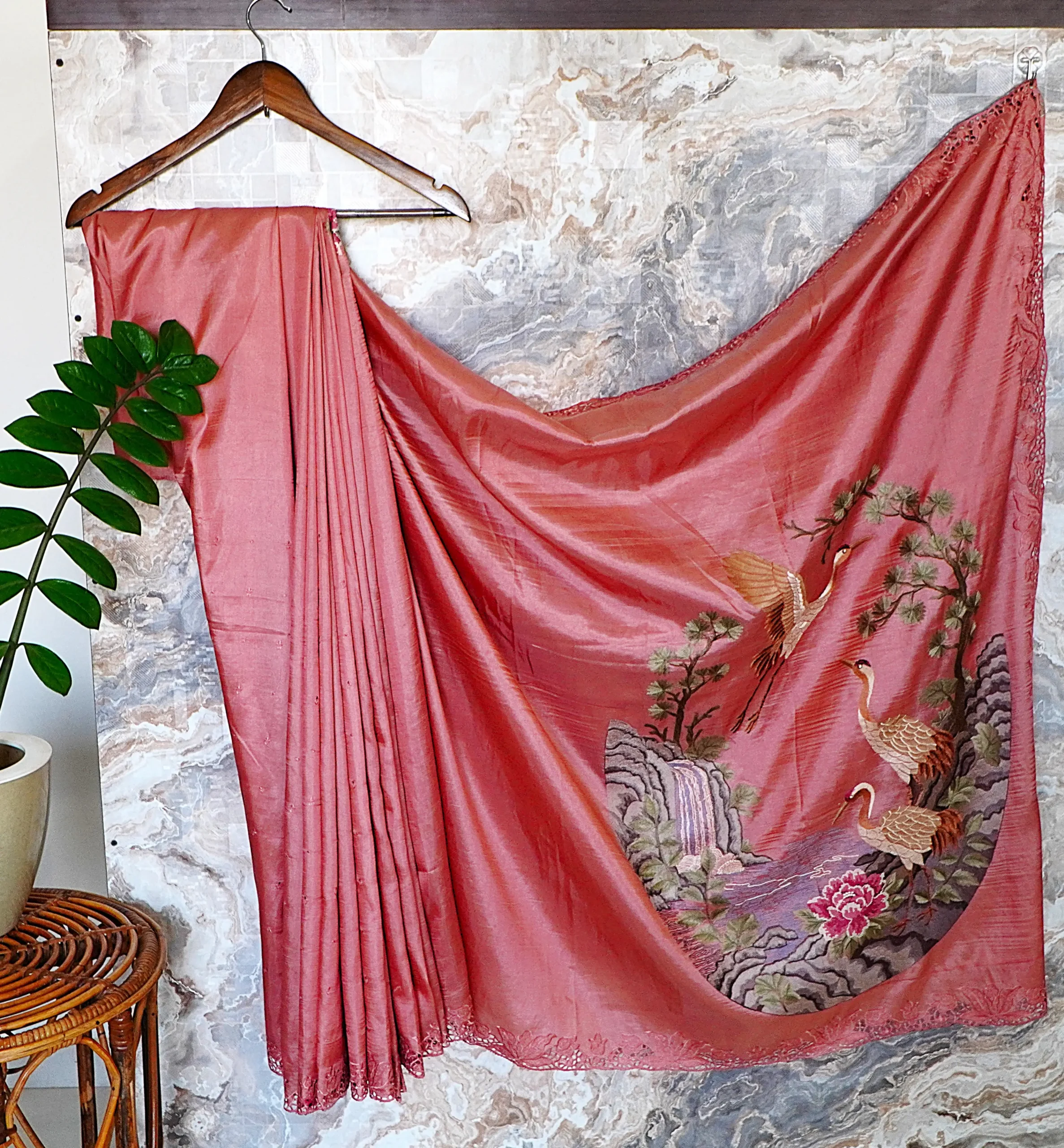 An elegant dusty rose silk saree featuring embroidered cranes, a serene waterfall motif, and delicate floral lace detailing.