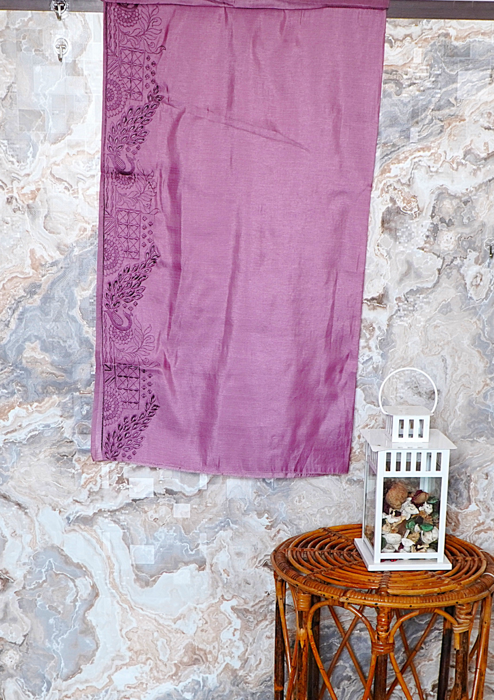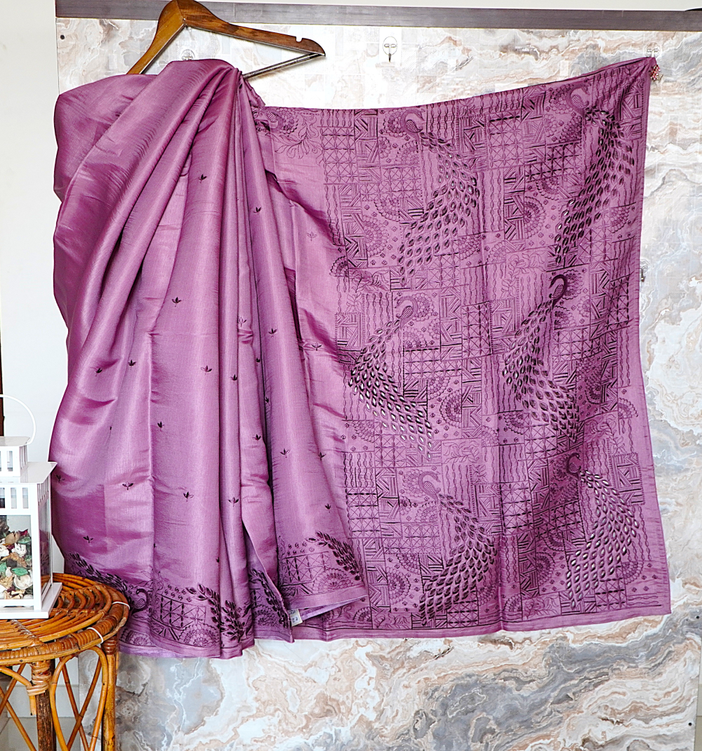 This elegant monochromatic dusty rose saree showcases an intricate all-over design of embroidered peacock motifs combined with subtle geometric grid patterns, creating a unique and artistic visual texture. The lightweight, shimmering fabric enhances its graceful and refined appeal.