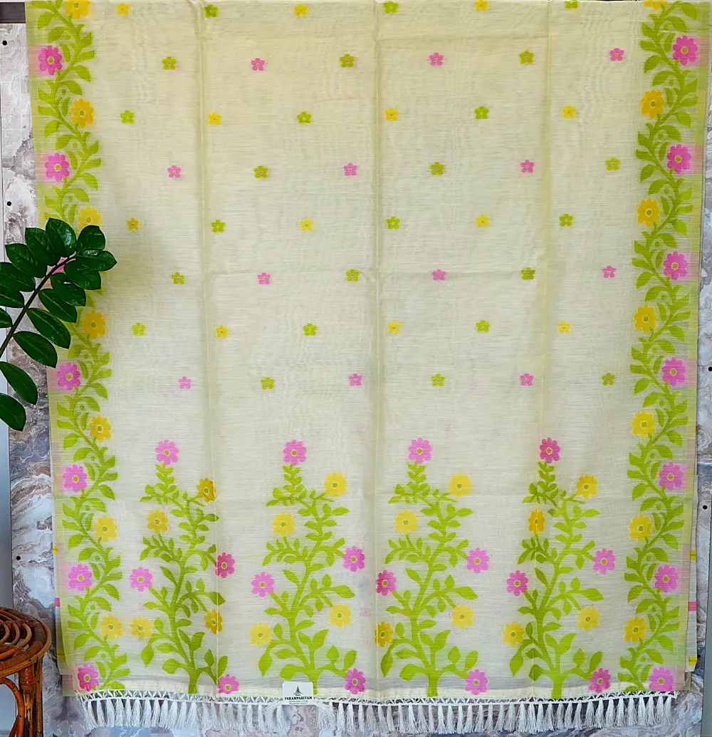 Step into soft elegance with this beautiful ivory silk cotton saree, featuring a light and airy texture that drapes effortlessly. The saree is adorned with vibrant floral vines and tiny buttis in shades of pink and yellow, creating a fresh and graceful look.