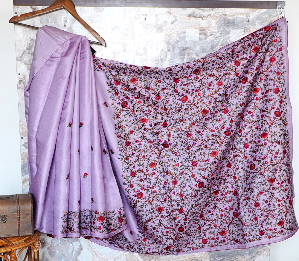 A lavender-lilac saree with rich floral jaal embroidery in terracotta tones and an intricate Kashmiri-style pallu.