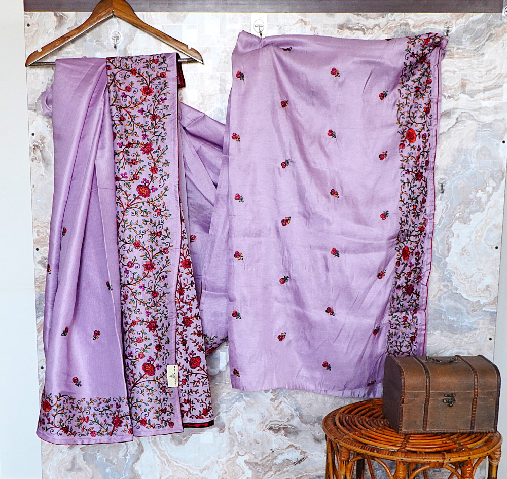 This elegant saree features a modern lavender-lilac base, beautifully adorned with a lush all-over floral jaal in warm terracotta and rose tones. Inspired by traditional Kashmiri craftsmanship, the design is enhanced with an intricately embroidered pallu that adds depth and timeless appeal.