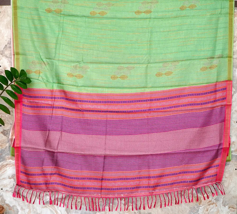 The saree is enhanced by a striking pink pallu, accented with bold blue and orange stripes and finished with stylish silk tassels, creating a lively and eye-catching contrast.
