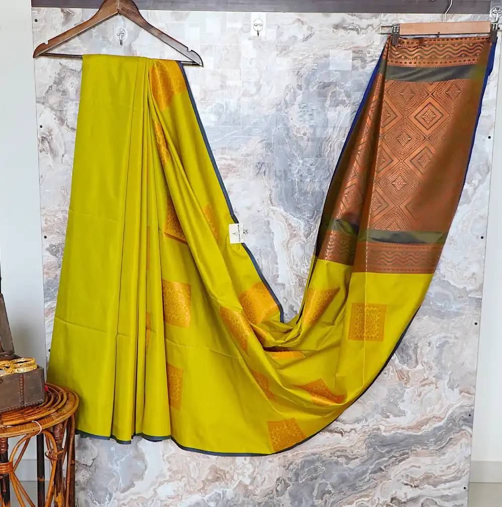 Vibrant lime-mustard semi-soft silk saree with bold gold zari square buttas, paired with an elegant olive-grey pallu featuring copper-toned geometric patterns.