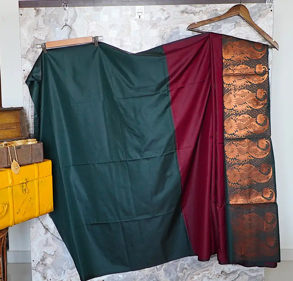 The look is elevated by a contrasting dark emerald green pallu, richly detailed with copper-toned gold zari work that enhances its regal appeal. The saree is finished with classic black tassels, adding a subtle yet sophisticated finish.