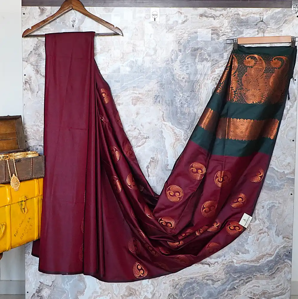 Step into timeless elegance with this beautifully crafted semi-soft silk saree, featuring a deep maroon body that radiates classic charm. The saree is adorned with intricate circular twin-paisley motifs, adding a refined traditional touch.
