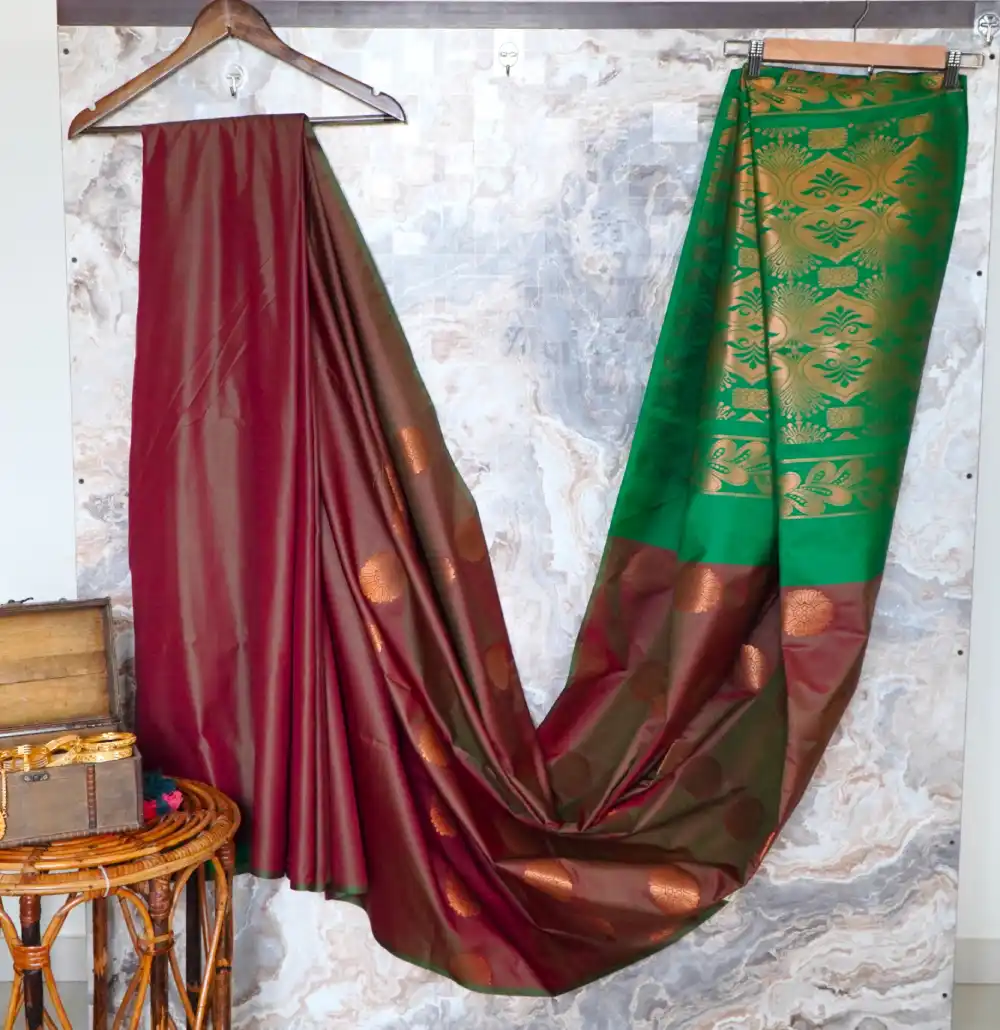 Rich metallic brownish-maroon semi-soft silk saree with floral buttas, paired with an elegant emerald green pallu featuring intricate gold zari motifs.