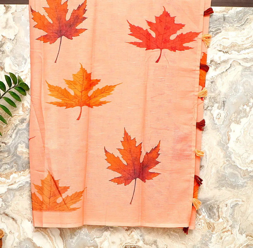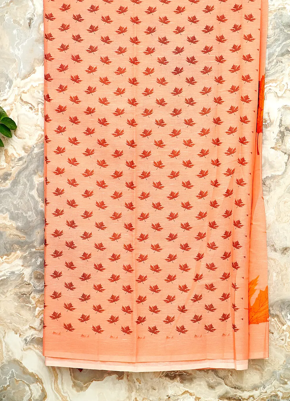 Bring the beauty of autumn into your wardrobe with this elegant peach linen saree, designed with a soft and soothing base that reflects natural charm.
