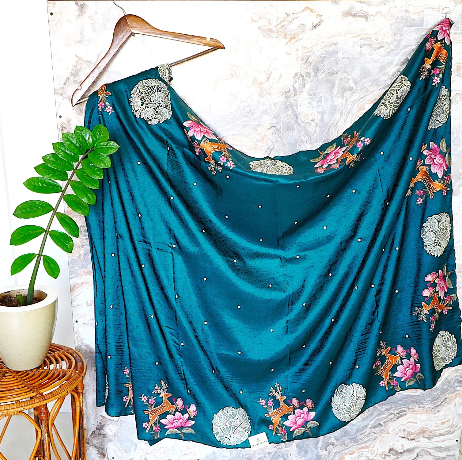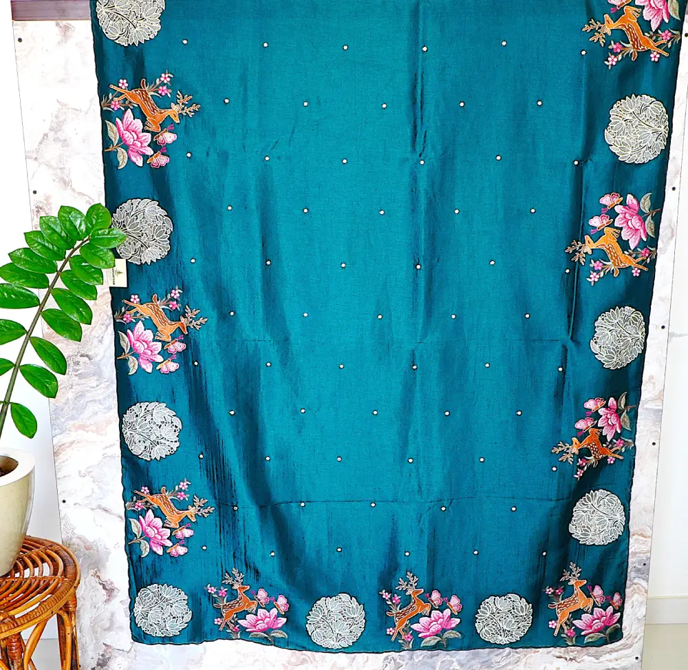 A peacock blue silk saree with golden deer motifs, soft floral embroidery, and delicate lace medallion detailing.