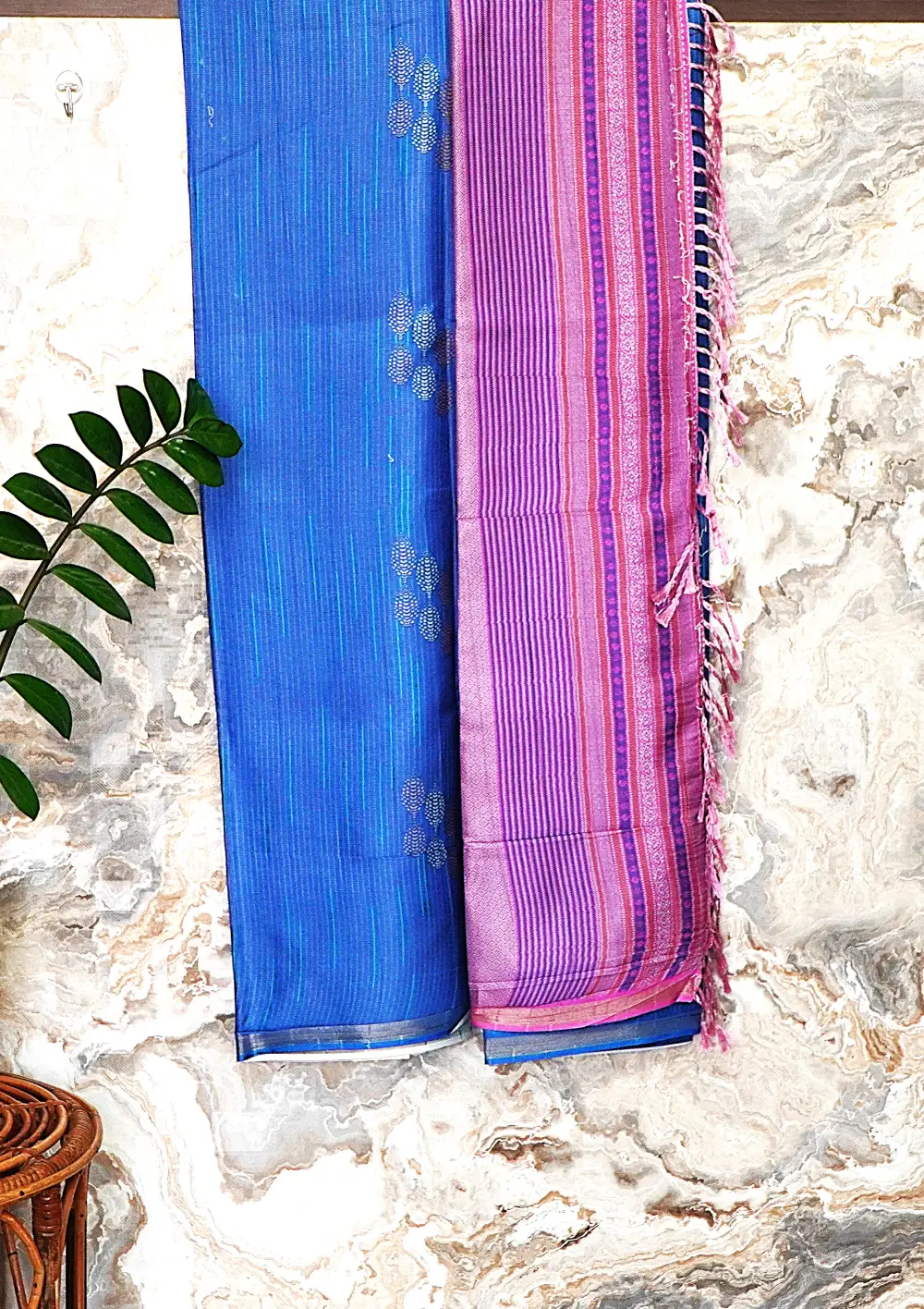 Make a graceful style statement with this elegant royal blue saree, featuring a textured body enhanced with delicate metallic leaf embroidery that adds a subtle shimmer and refined appeal.