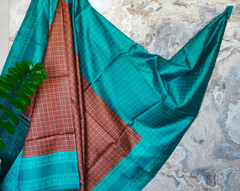 The ensemble is completed with a matching teal silk-blend blouse piece, designed with a checked pattern and ornamental woven borders, perfectly complementing the saree.