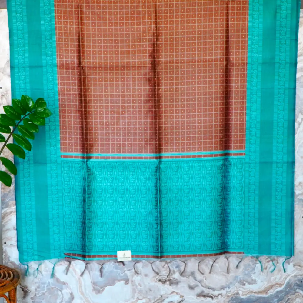 Add a touch of timeless tradition to your wardrobe with this elegant russet-brown saree, featuring a delicate grid pattern adorned with tiny buttis that create a subtle and refined texture.
