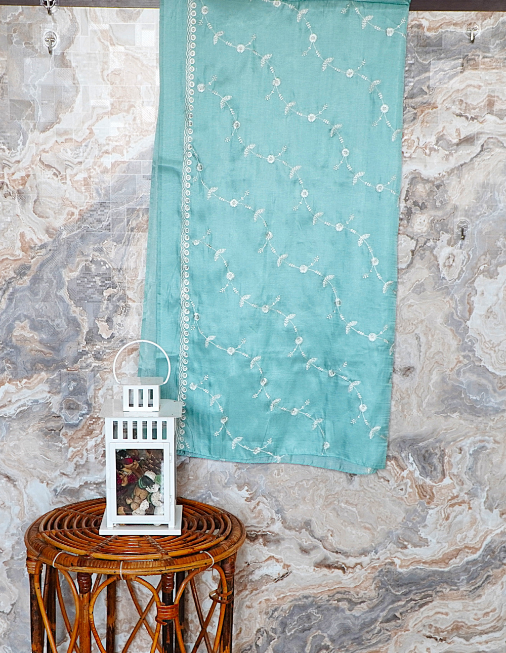 This elegant seafoam satin saree features an ethereal blend of delicate white paisley motifs set against a soft, lightweight, and translucent fabric. The soothing tone combined with intricate detailing creates a refreshing and graceful aesthetic.