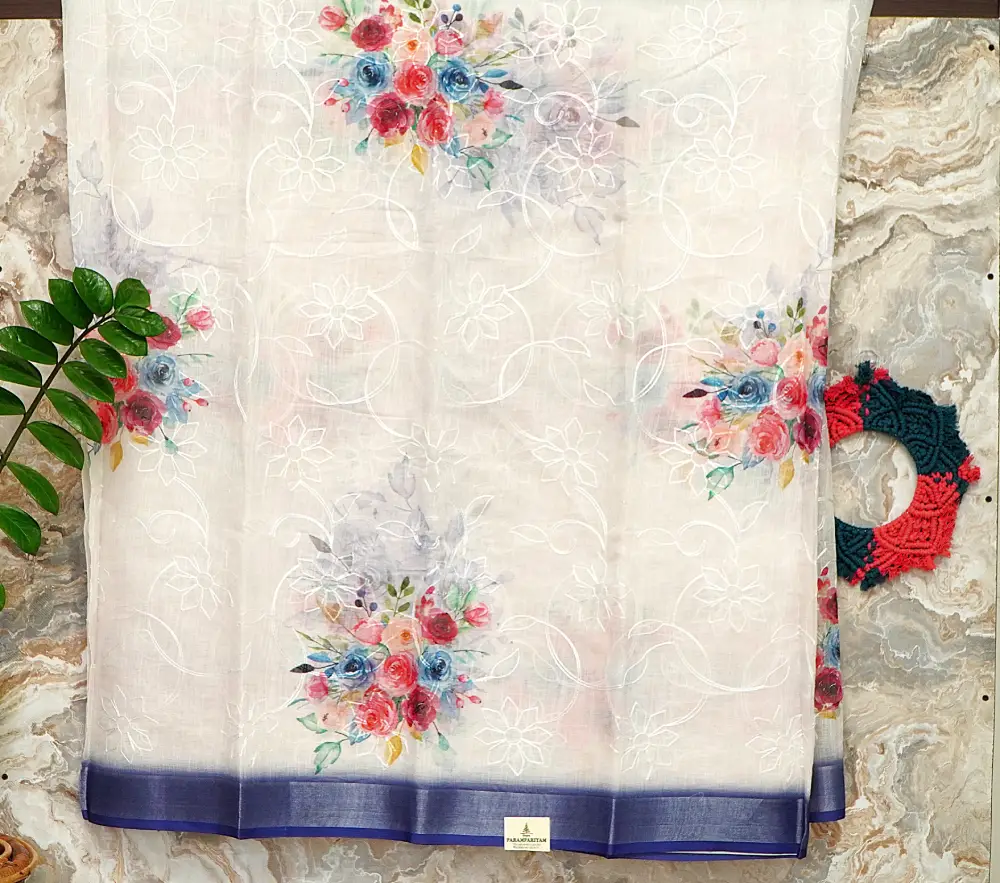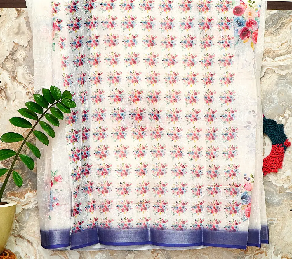 Elevate your elegance with this graceful silver-white linen saree, designed with a soft, shimmering texture that exudes sophistication. The saree features a vibrant focal bouquet of royal blue and crimson blooms, creating a striking yet refined floral statement.