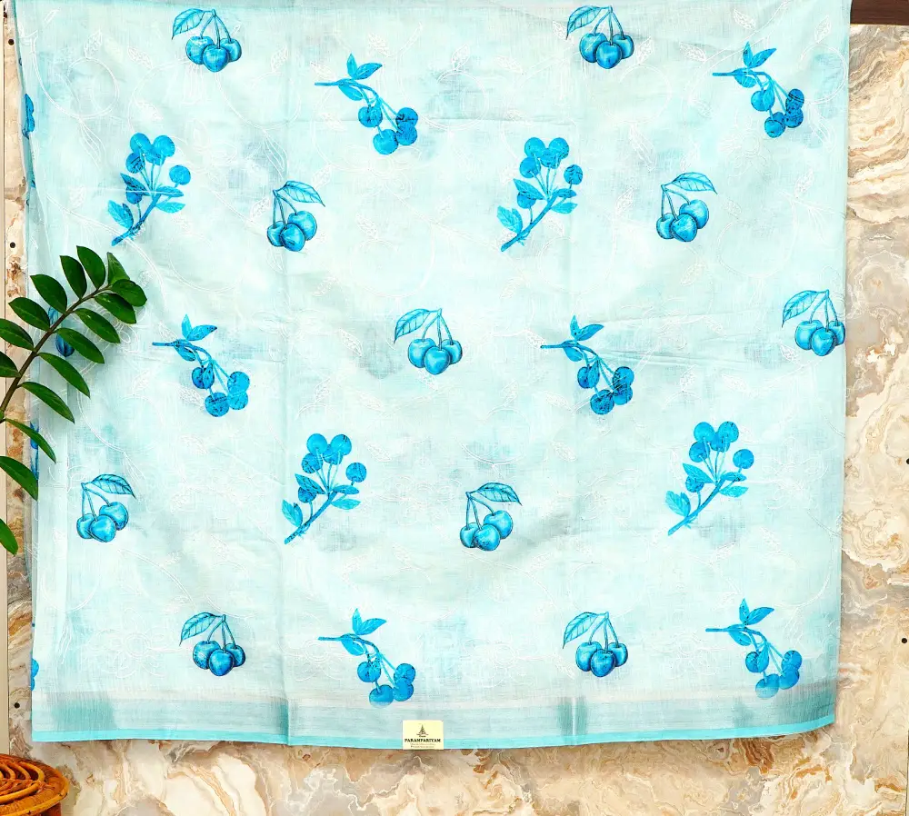 Add a playful yet elegant touch to your wardrobe with this charming sky-blue linen saree, featuring a whimsical digital print of royal blue cherries that brings a fresh and lively appeal.