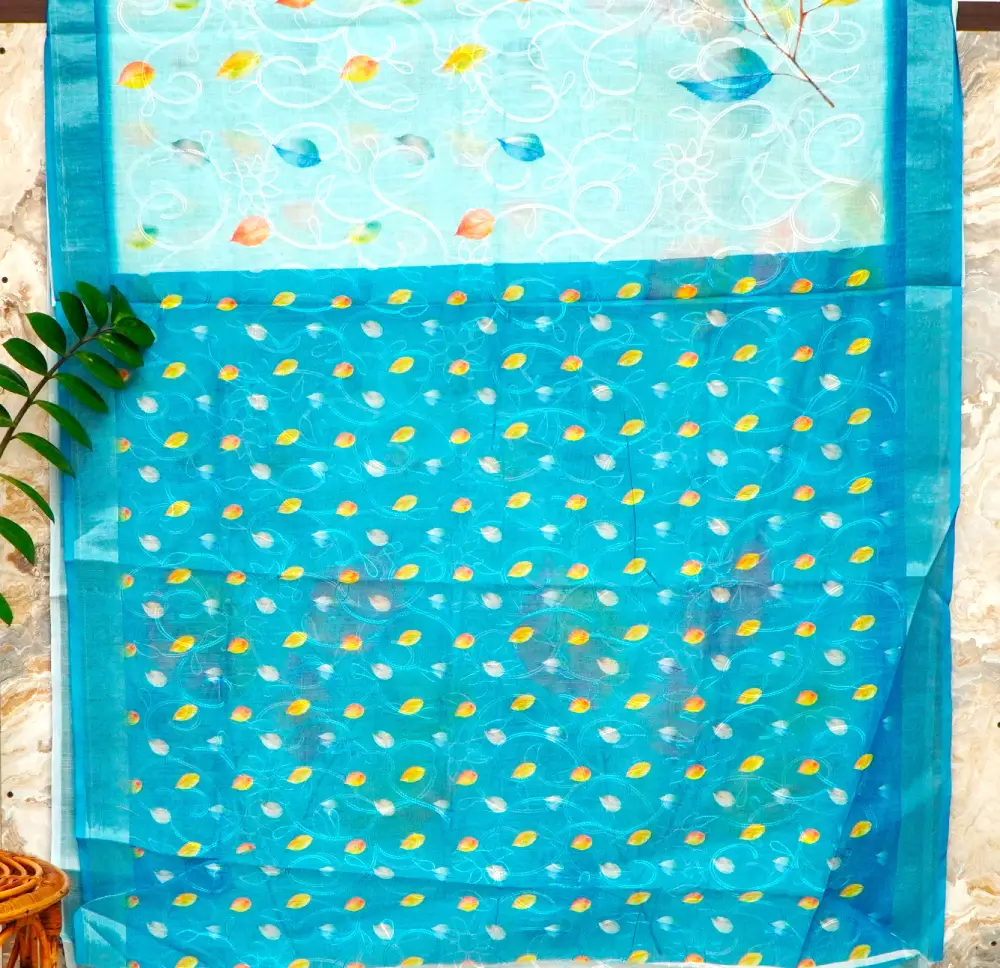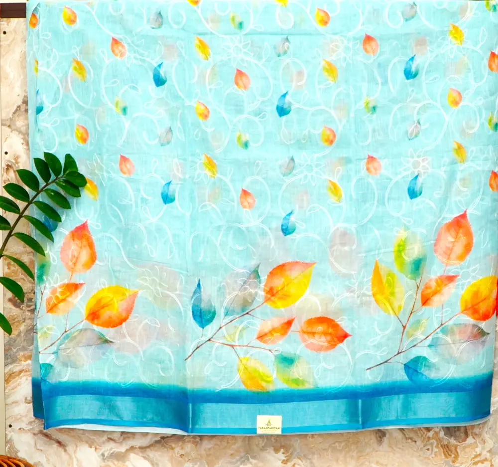 Sky-blue linen saree with autumn leaf prints, white embroidery, and a teal zari border, paired with a matching blouse.
