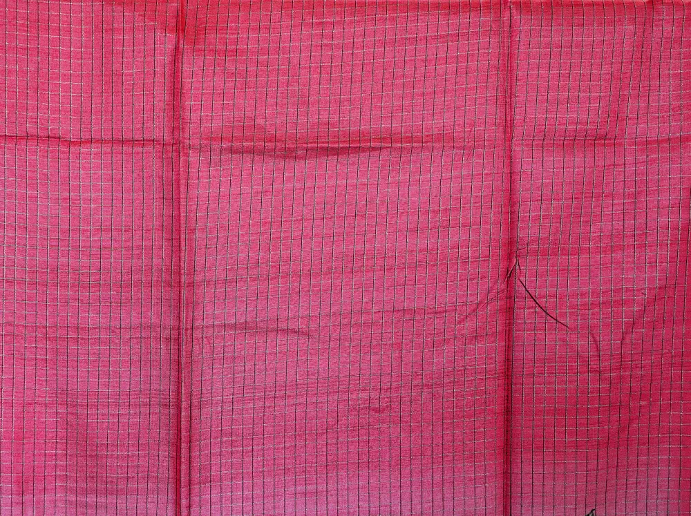 Add a vibrant and artistic touch to your wardrobe with this beautiful cotton-silk blend saree, featuring a lively watermelon-pink checkered body enhanced with subtle leaf prints for a fresh and elegant look.