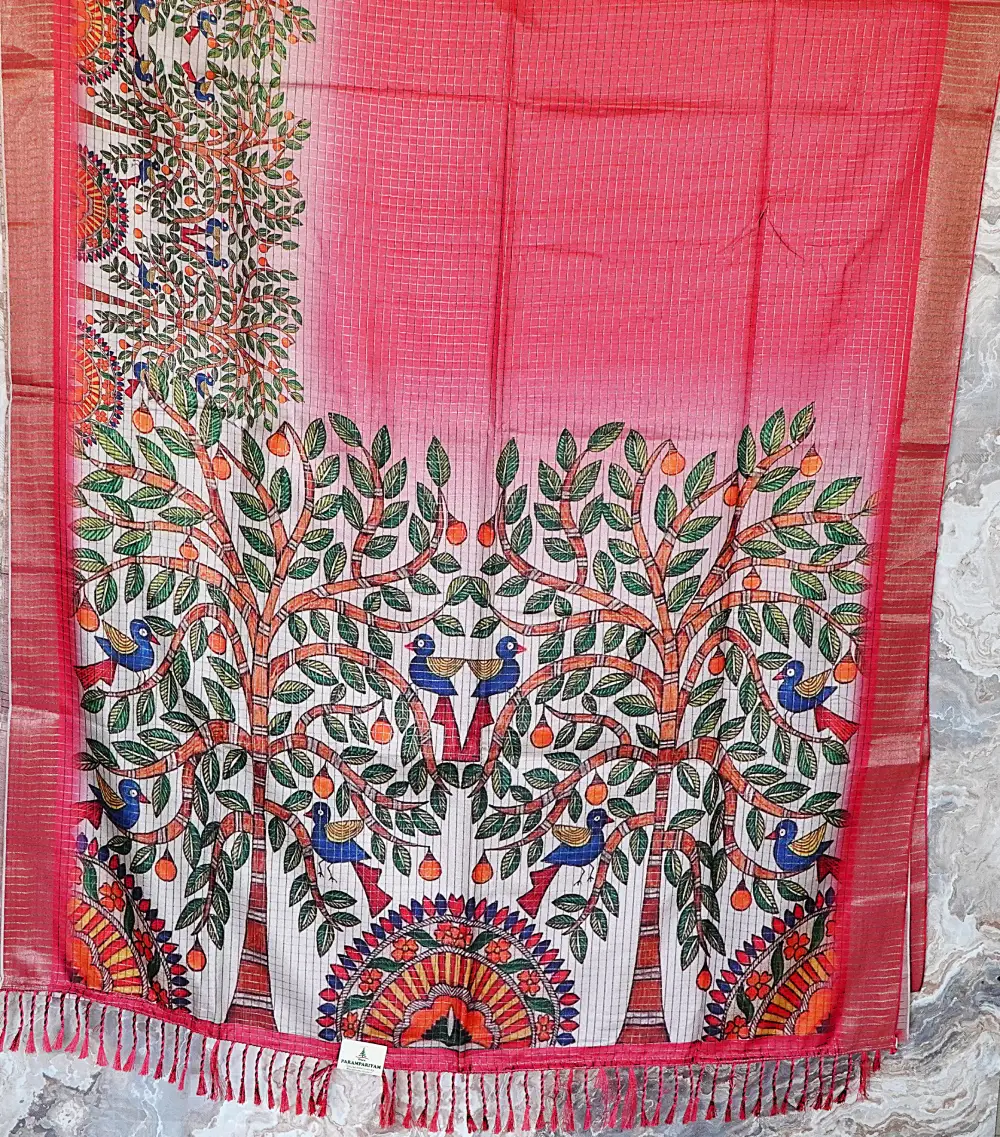 - Design: Checkered pattern with leaf prints and Tree of Life pallu