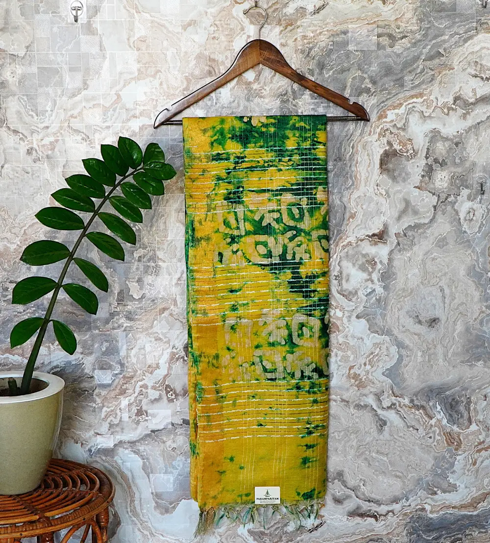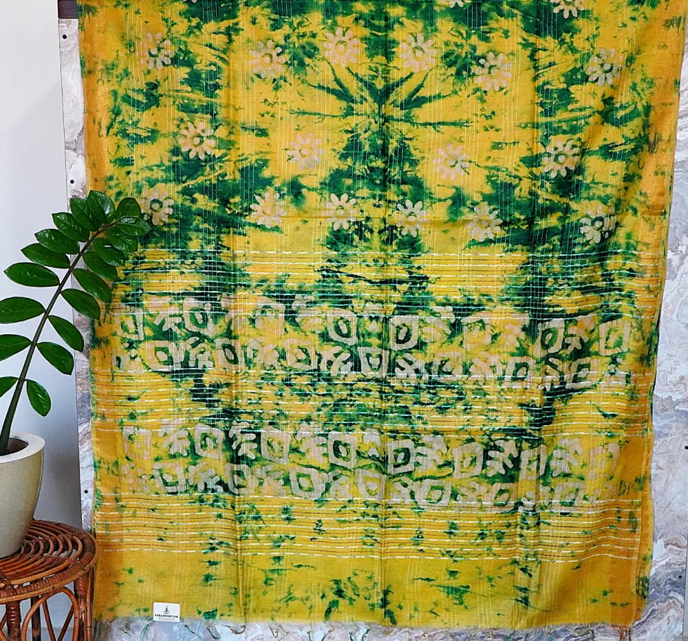 Add a fresh and contemporary touch to your wardrobe with this beautiful yellow and forest green tie-dye saree. Crafted with a lightweight and slightly shimmering texture, the saree is adorned with soft cream floral motifs that enhance its vibrant appeal.